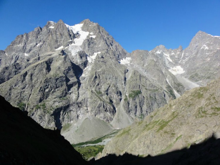Na začetku naju je kljub vetru še grelo sonce - nasproti desno štiritisočak Barre des Ecrins (4102 m)