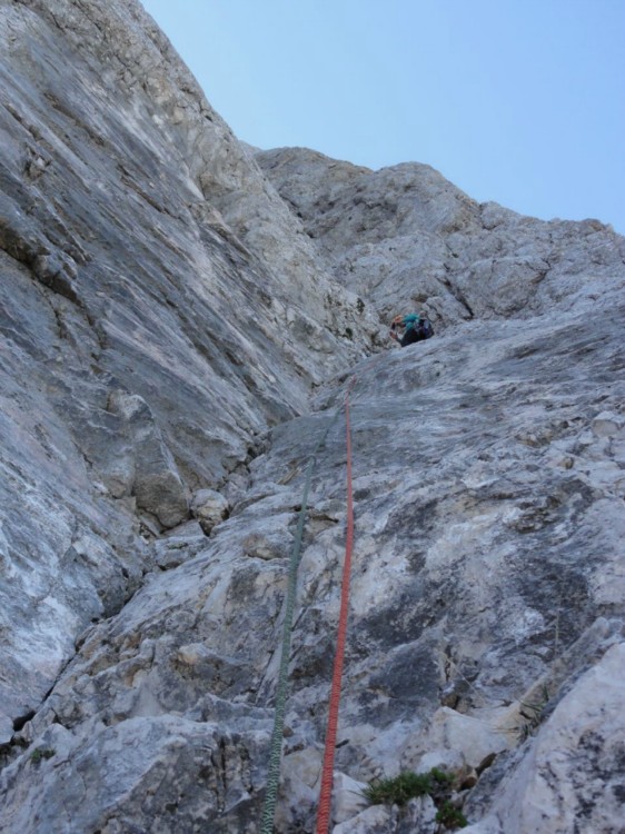 V zgornji tretjini stene se končno prične markantna velika zajeda dolga 4 cuge