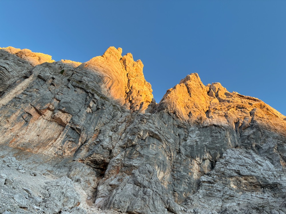 Bravo, divja tura. Podrt svet, kolikor se spomnim je bilo v določenih cugih zelo težko zabiti klin, ker skala kar leti narazen. Pred leti sva s kolegom obračala na stiku s Škrlatiškimi gredami, ker sva bila pozna. Se pa ne spomnim abzajla do Zvona. Midva sva vstopila skrajno levo in potem prečila strmo pobočje proti desni. Tik pred zvonom sva se še malo povarovala. Je pa verjetno opcij toliko kot je naložene robe po policah in kaminih.