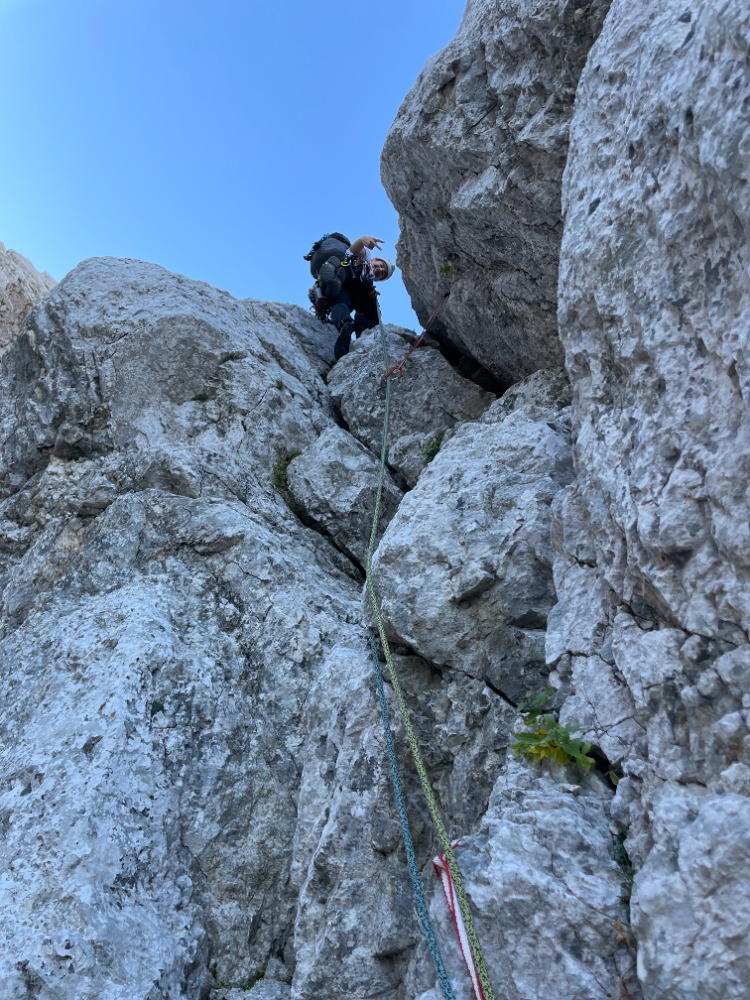 "Vem da danes bo srečen dan, to sem začutil že zjutraj." Ta zjutraj je bil en dan prej, v soboto. Vzpon sva končala v nedeljo. Kot mlajša pripravnika sva se raje navezala na delih, kjer se marsikdo ne bi. To sva "plačala" s časom, saj sva utrujena bivakirala 30m pod izstopom iz smeri. Better safe than sorry. Odlična izkušnja in lekcija, da je treba povaditi hitrost v krajših smereh.