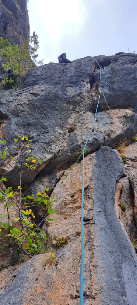 Špela pleza 8ajke pa sva se zmenila, da greva za zadnji dan nekaj lepega. Večer prej gledava za kratke 7ke, pa nama je bolj všeč izrazit detajl 7b+, kot bolj konstantno pa 7b. Začnem jaz, drugi cug (v resnici na polici štant, tako da 2) gre Špela, potem se pa za detajlni cug zmeniva, da ga grem naprej jaz, pustim komplete notri, se spustim, da ga greva lahko oba v vodstvu. Ko se spustim povem še beto, obema uspe, potem mi pa še z ruzakom prosto uspe kot drugi. Naprej grem jaz, potem Špela (ki malo oteži smer, ker vmes preči na sosednjo desno) in jaz do vrha.
