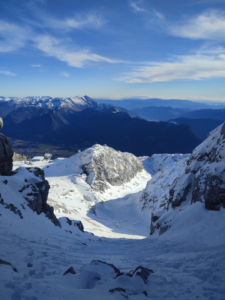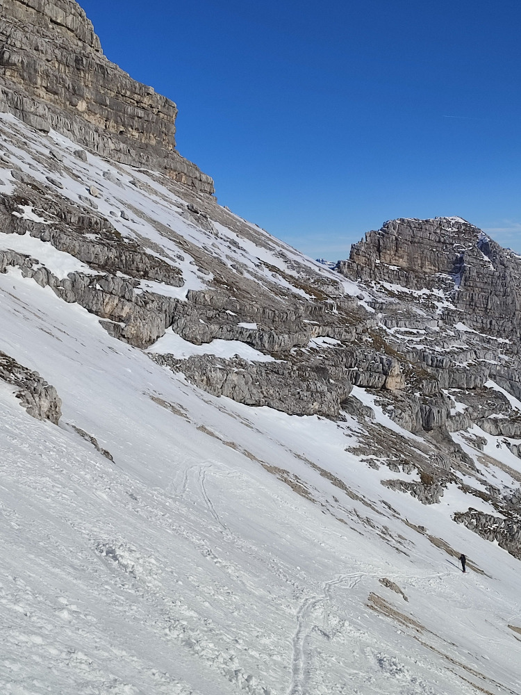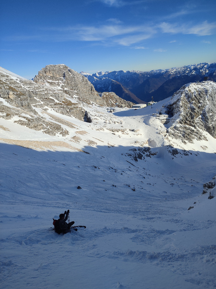 Sneg se je na osojnem pobočju do dvanajstih že precej zmehčal, zato je bil vzpon kar zahteven. Kmalu sem ugotovil, da bo šlo hitreje v pancarjih, saj je bila osenčena grapa še lepo čvrsta. Na vrhu sem ob pogledu navzdol kaj hitro ugotovil, da bo zame to malo prestrmo, preozko in pretrdo. Tokrat bo šlo zares.