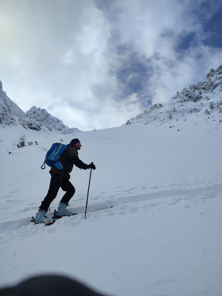 Kava v Tržiču ob 8. Stanka ima veze, zato dobimo še krofe – pa še za popotnico. Na parkirišču ugotovim, da je eden izmed mentorjev vzel napačne pse, drugi pa ni čisto ziher, ali gredo sploh na smučke. Ampak preden se spravim v pancarje, Stanka rola duct tape, Aleš pa vezice in zadeva je rešena. Stanka mi popravlja obrate, dokler se mi smučka neha zatikati v sneg, Aleš pa preverja zgornjo plast. V zgornjem delu tudi nemarno piha. Stanka se raje odloči še za dodaten spust. Z Alešom sicer nisva ziher, ampak po ogledu Alpskih bojevnikov vem, da cilj ni dosežen brez vrha! Od sedla sledi še delno spihano ruševje. Gor težko, dol pa še težje. Slajdam. Nekje na polovici me Aleš le prepriča v prvi zavoj, pa drugega – in gremo! Ob spustu vsi vriskamo. Kljub pozni uri je ostalo še nekaj nezvoženega. Na Aleša letijo pohvale za izbiro ture. Lačni. Stanka obrne telefon in že imamo mizo pri Damotu. Seveda se vsi odločimo za valentinov meni. 😄