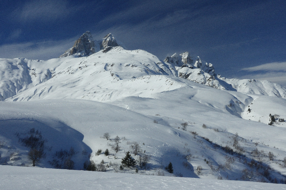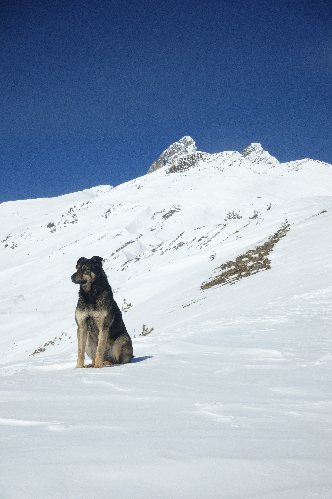 4WD taksi nas zapelje do izhodišča kakšne pol ure iz Mestie. To je tudi naše prvo srečanje z Gruzijskimi cestami, zato ga prosimo, da nas odloži krepko pred predvidenim izhodiščem. Začudeno nas pogleda, a se ne brani. Prvo se vzpenjamo po cesti, nato zavijemo na travnata pobočja, ves čas po že dobro vhojeni špuri. Na vrhu planote se nam od bogvekje pridruži mali kuža. Razmere so prav poletne. Del ekipe zagrize še dodatnih 400m do vrha prelaza, od koder se prikaže mogočna Ušba, sam pa raje naredim še en ECT. Če že nosim žago… Spust je kar zhteven, saj je južna stran skorjasta in precej zvožena. No, v kakšni kotanji pa pod nogami začutimo tudi pršič.