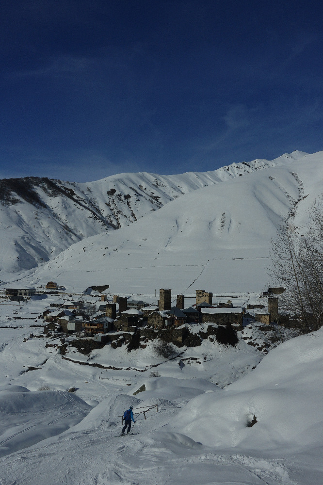 Od začetka do konca pravljica. S smučmi se sprehodimo čez čudovito vasico in se začnemo vzpenjati po ozki dolini. Spodaj je južno, a tokrat rinemo v severno steno. Kmalu se nam pogled odpre na razčlenjeno planoto, polno še nedotaknjenih pobočij. Z vrha se lepo vidijo Ušba, Šhara in celo mogočni Elbrus. Odpeljemo se naprej po grebenu. Severna stran je nedotaknjena. Bađo prvi popusti pritisku in sname kože. Za trenutek oklevam, a samo enkrat se živi. Čez opasti se poženeva na belo pobočje. Padem. V nežen objem deviškega pršiča. Potopim se, a odeja me takoj izpljune. Tomi je imel prav. Široke dile so lajf! V belih oblakih drvim po pobočju. Vriskam. Oba vriskava. Ko se zbrihtava, natakneva kože in se odpraviva nazaj proti grebenu, kjer se zberemo. Tudi spust je čudovit, a sneg postaja malce skorjast. Vseeno super smučanje čisto do izhodišča, kjer nam Gruzijec v roko praktično porine pivo. Do taksista imamo še dobri dve uri, ki ju zapolnimo s čačo in kačapurijem v bližnji gostilni.
