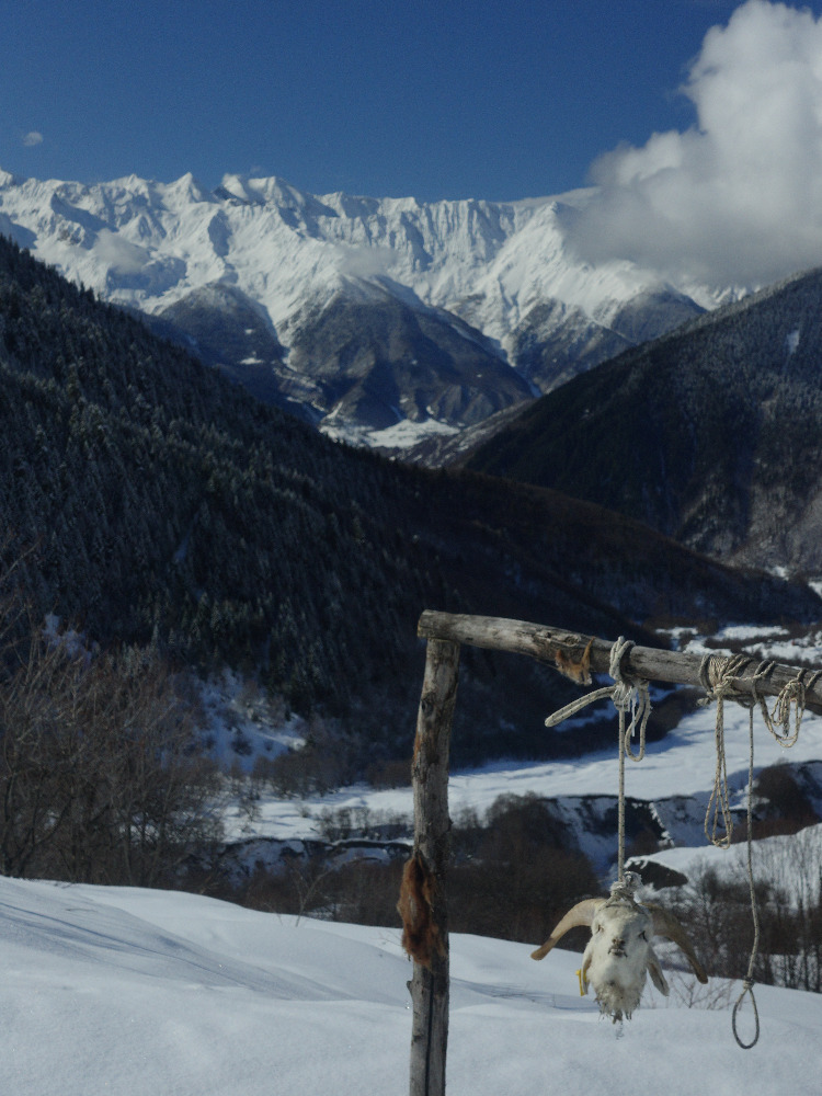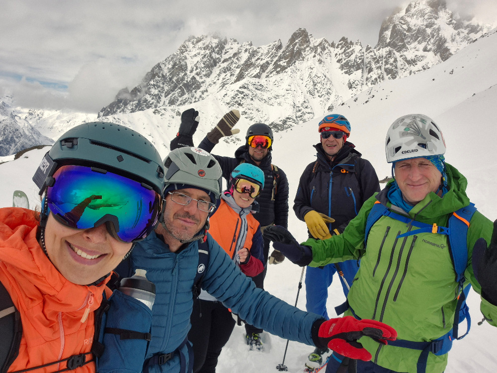 Spodnji del vzpona obcudujemo mogocno Ushbo, nakar pot zavije proti vzhodu. Vedno manj pomrznjena skorja z višino prehaja v pršič. Z Mihom ponovno narediva ECT, medtem ko ostali brezbrižno hitijo k vrhu. Sprašujem se, če ne bi bilo bolj smiselno, da najhitrejši delajo test. Tako bi ravno skupaj prispeli na cilj. Mimo pride lokalec in vpraša, če sva gajda. Na nek način verjetno sva. V smislu, da skrbiva za varnost sebe in tovarišev. Italjan na splitboardu se nama zahvali za dobro delo. Hočem mu reči, da naj v zahvalo sam izkoplje luknjo, pa se ugriznem v jezik. Ni vsakemu dano. Ko prideva na vrh, so ostali že odstranili kože in nama smučajo nasproti. V bistvu jih tudi rezultat testa ne zanima. Ali je bil sploh narejen, ce ne vedo za rezultat? Ampak nekdo ve. Jaz vem in s tem omogocam njihovo brezskrbnost. In jim privoščim varen smuk. Tudi midva se spustiva. Ker sva zadnja, je powder malo bolj pofuran, kot bi bil, ce ne bi delala prereza, a prav nič nisva zagrenjena.