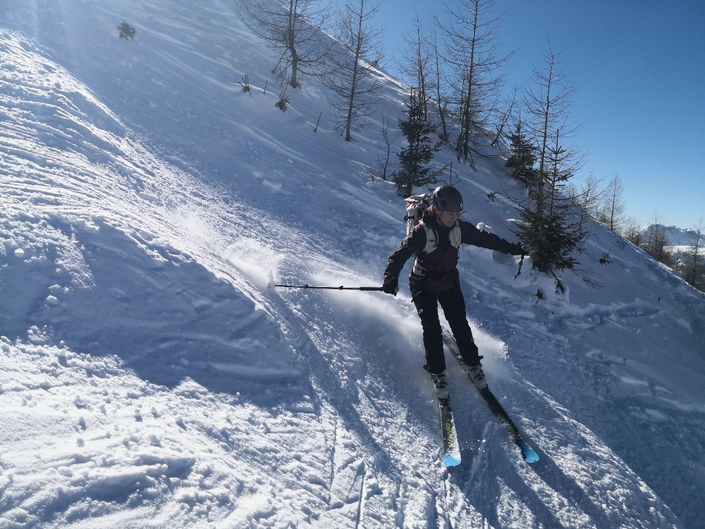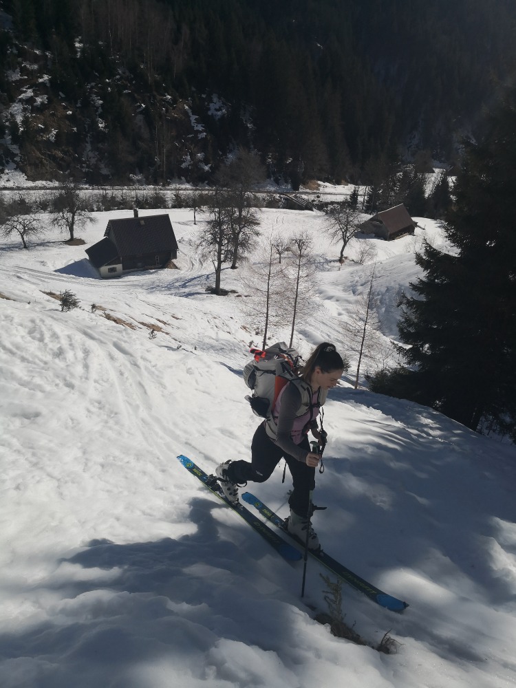 Lep topel dan, dobra družba, pogoji za smučanje prav nič uživaški (malo južnega, malo skorjice, malo trdega, razrito od prejšnjih dni itak...), a za učenje in nabiranje izkušenj novopečene turne smučarke pa precej koristno in prav nič prelahko.
