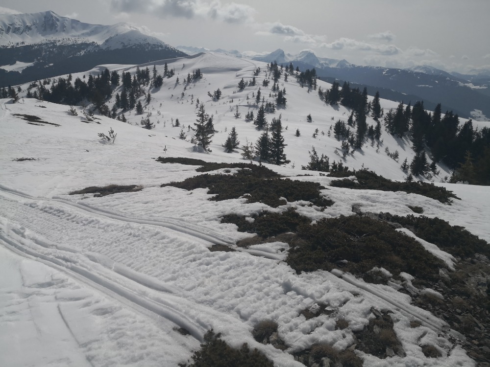 Lep spomladanski srenc nam je ponudil lep spust z vrha, a meni malo premalo. Kratko in sladko. Nižje doli nekaj zoprnega prebijanja skozi gozd, a vse skupaj v redu turca.