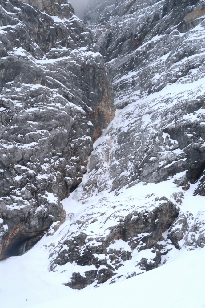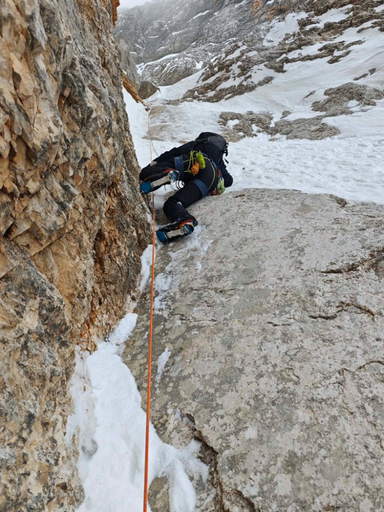 Dobra! Sneg v strminah za silo predelan, tako da so vijaki bili za varovanje bolj za psiho. Drugi cug ima ledeni trak širine pol metra....in ko po prvih treh cugih misliš, da so vsi detajli že za tabo, te čaka res lep mix en raztežaj pod prečko.