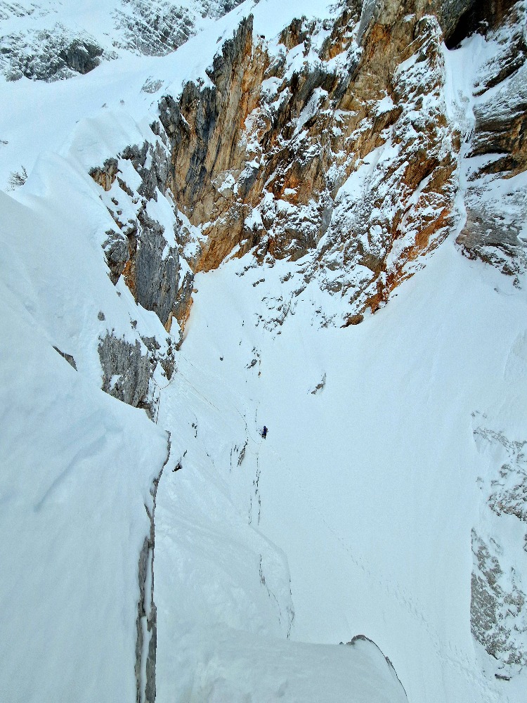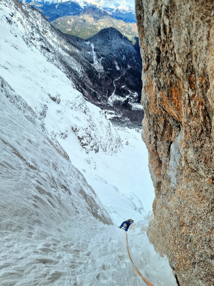 Zaradi novega snega je blo treba znova zgazit pot. Švicanje in sopihanje do vztopa. V smeri je še nekaj slabšega ledu in zbitega snega, ki še kar dobro primeta. Na vmesnih položnejših delih se kar udira. Stare stopnicke so zalite z novim snegom. Na predzadnjem raztežaju je na dveh delih še vedno lep (ali pa ne lep, kakor za koga) mix climb, ki je meni bil lažji kot drugi raztežaj, ker sem zaradi svoje višine samo 1x stopil na skalo, pol sm pa že lahk spet cepin zabil 😆Izstopna prečka psihično in fizicno zahtevna. Sestop mimo koče na Ledinah, do grape pa tud. Ambient pa čist fascinanten. 👌😀