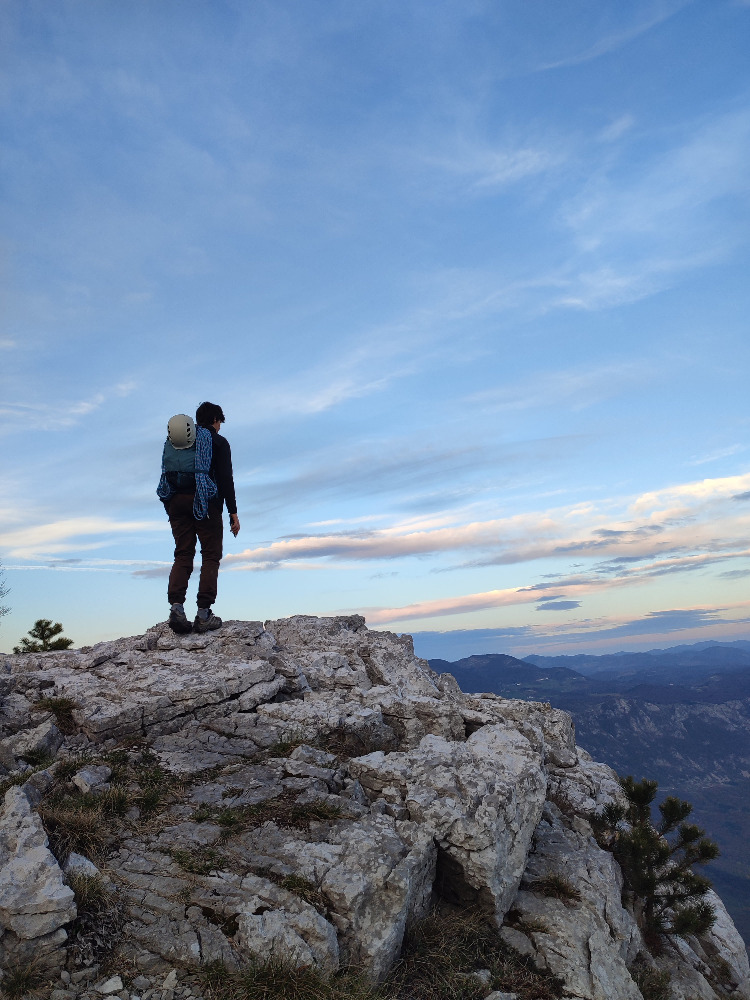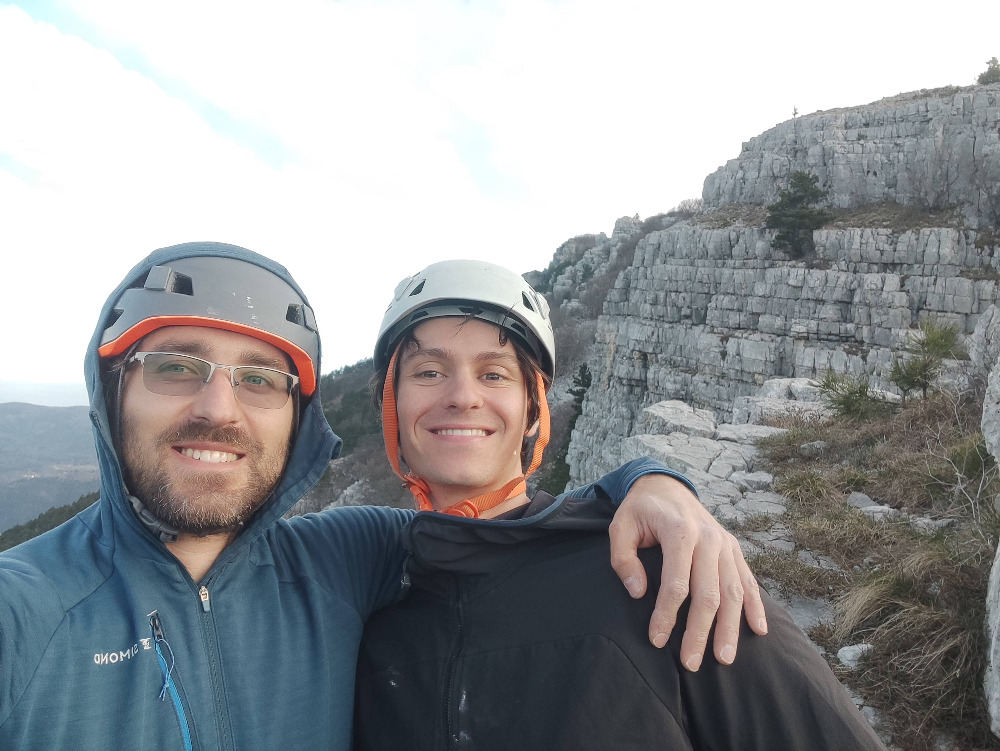 Zadnji detajlni raztežaj pripade Jakobu. Ko gledam, kako toe-hooka, sem kar vesel, da ga je dobil on. Še na top rope sem presran, ker me Jakob do konca zateguje samo na eno polovičko, a mi ostanki ponosa preprečijo, da bi na glas protestiral. Tale je bila pa res več kot V – ravno prav resna za začetek dolge in plodne alpinistične kariere.