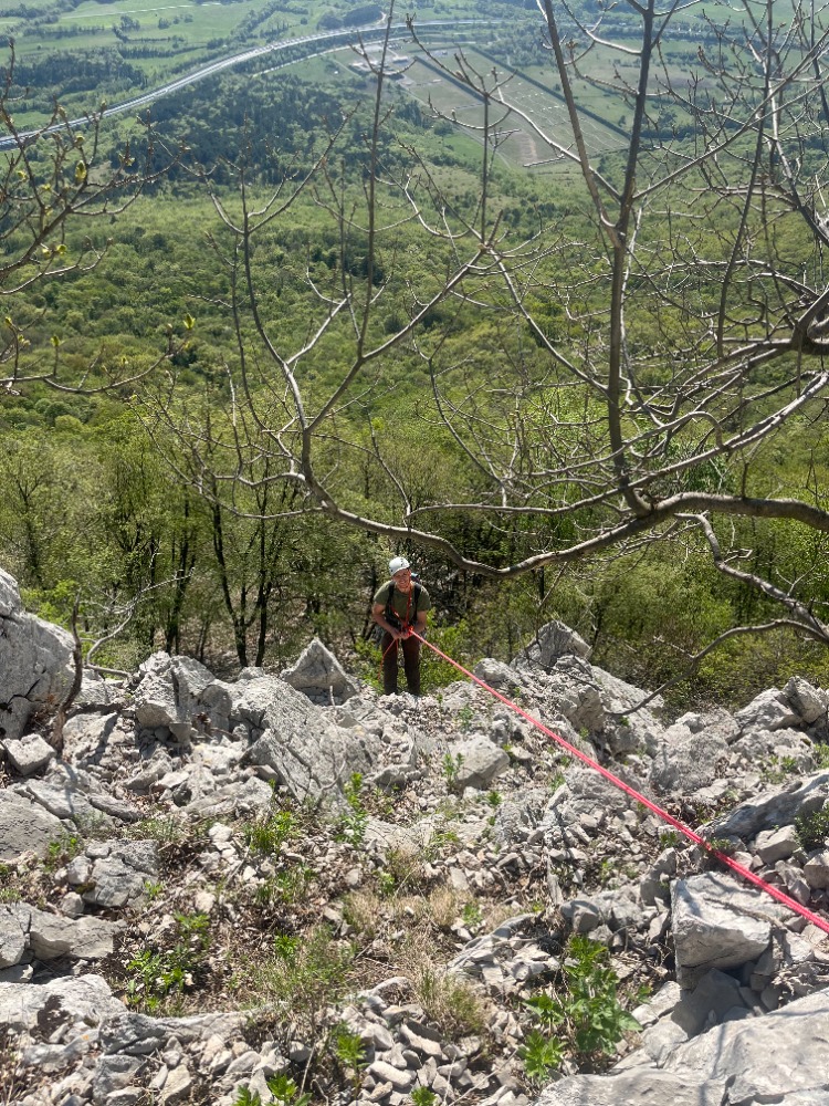 Takoj ko opaziva tri kline v prvem raztežaju se že razveseliva, a sva sredi drugega cuga kmalu prizemljena ob ugotovitvi, da bova do piknika namesto plezarije vadila abzajl.