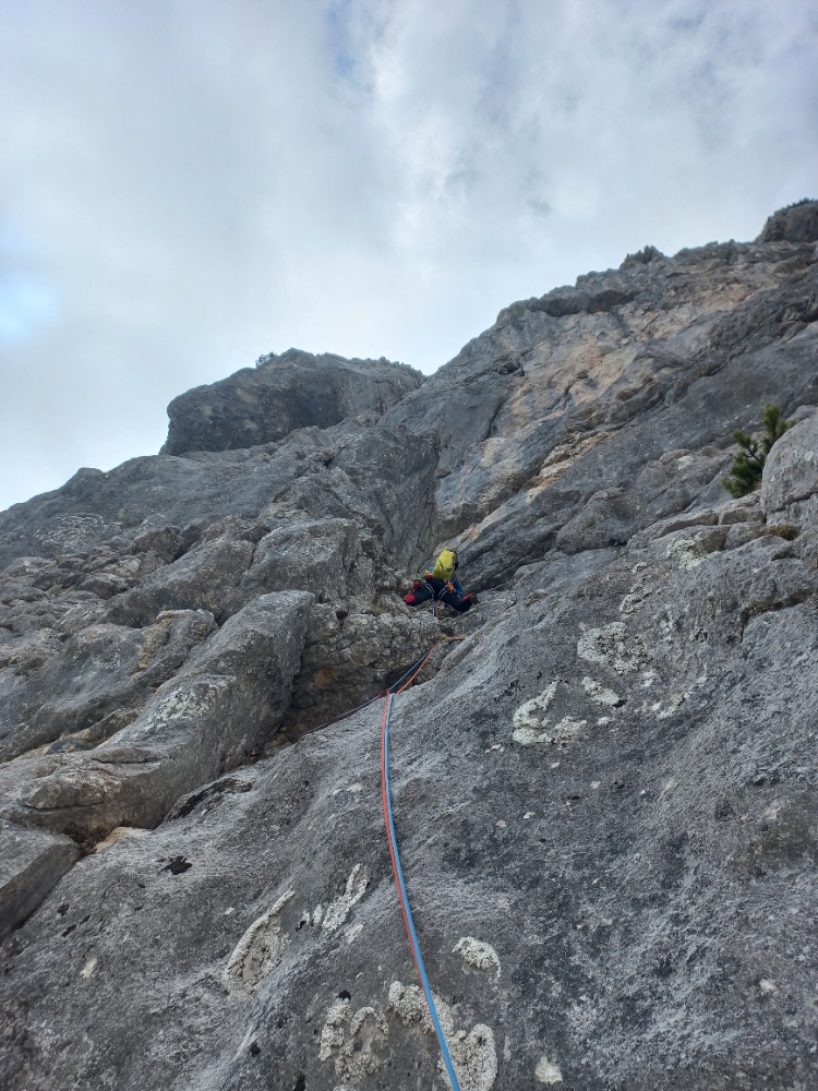 Dobra izkušnja. Prva dva raztežaja sem preplezal precej malodušen, varovanje se mi je zdelo preskopo za udobno plezanje in glava nekako ni želela preklopiti na izpostavljeno plezanje v skali. Na srečo je bil Miha bolj zagnan in navdušen, tako da je vlekel navezo do vrha, predvsem mentalno, pa tudi fizično, saj je odločno in suvereno odplezal najtežje raztežaje