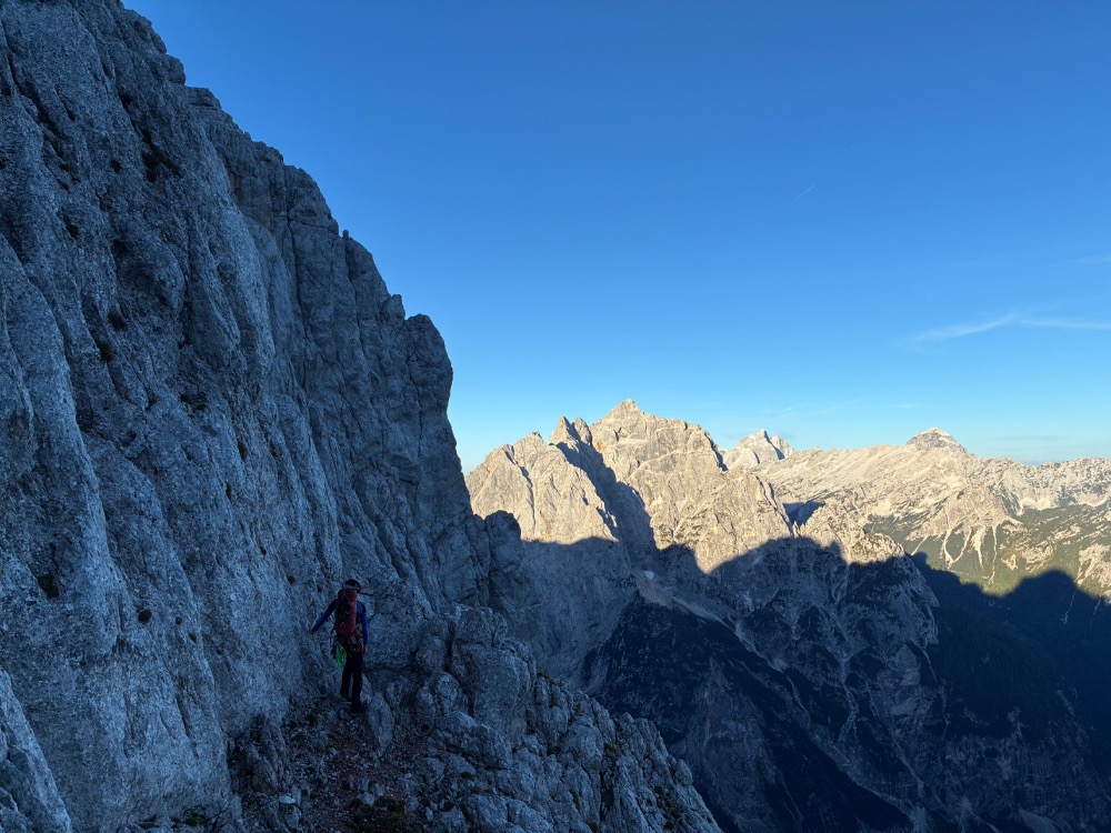No, tam ko sva abzajlala, pomoje še ti ne bi plezal dol 😂 hahaha, zgleda se da pridit do une zadnje gredice proti Zvonu tudi po nekem prečenju brez abzajla … ah, prav imaš, tam je cel labirint pravih in napačnih opcij 🙈 te kaj mika tris Skalaških v enem šusu? 🫡