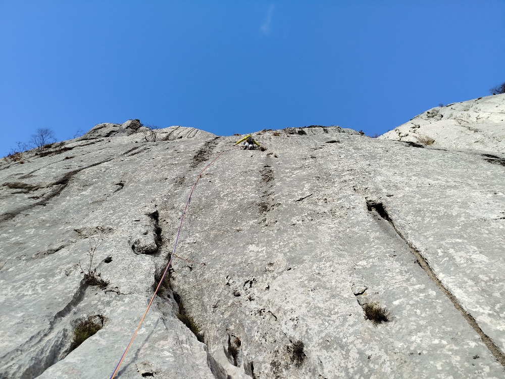 Po moji pomoti sva zaplezala v 7a+ plato namesto v lepo 6c poč. Se zgodi. Ne bi bila presenečena če bi bile tudi 6c plate v dabarcih tako peklenske, pri plati nikoli ne veš. Še zdaj mi ni jasno kako je šlo, ampak sva se oba priplazla čez. Zgornji del smeri je šel čez moker "štrajfn" zato sva izstopila po Viperi. Zelo lep izstop.