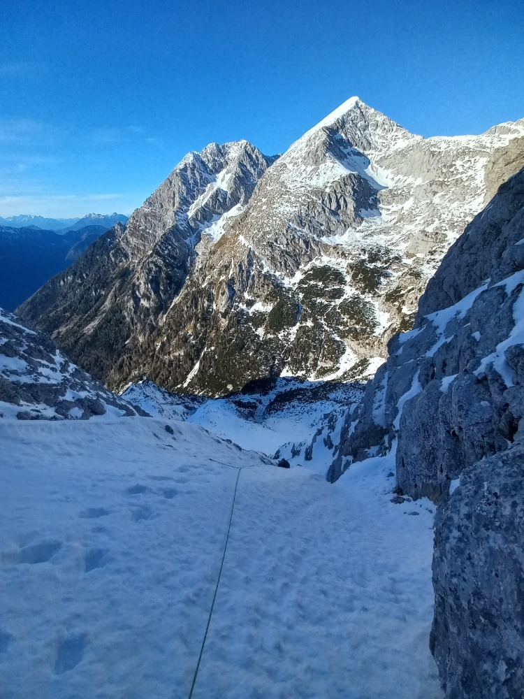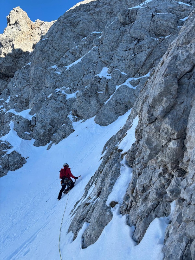 Lepa, kratka in prijazna smer, v katero sva vstopila pomotoma, misleč, da plezava Grapo med Veliko in malo Kalško goro. Snega nekaj je, a ni najbolj kvaliteten, sploh proti vrhu vse bolj prhek. V detajlu so iz snega gledali klini stare zavarovane poti, ki sva jih uporabila za varovanje, kar je sicer sitne razmere spremenilo v zabavno dogodivščino ![]()