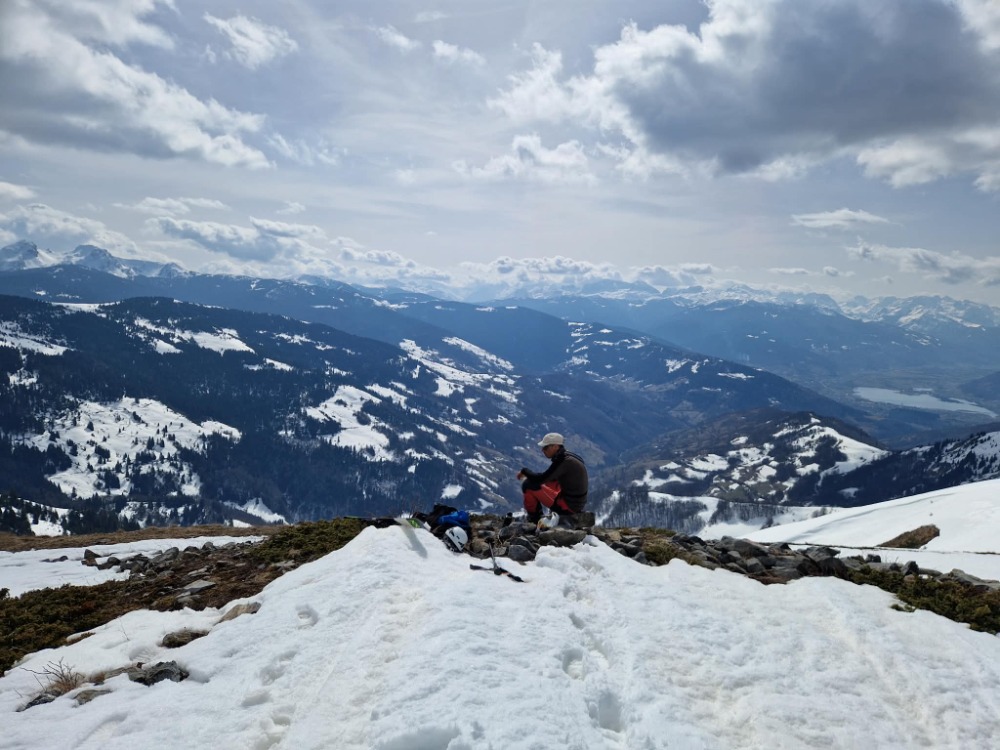 Lep spomladanski srenc nam je ponudil lep spust z vrha, a meni malo premalo. Kratko in sladko. Nižje doli nekaj zoprnega prebijanja skozi gozd, a vse skupaj v redu turca.