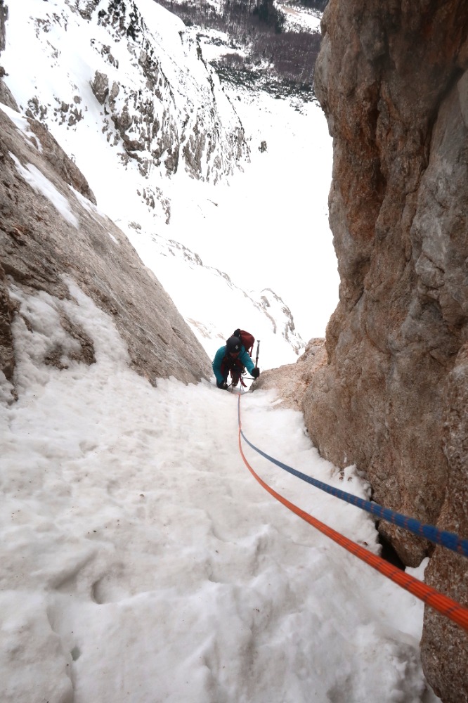 Dobra! Sneg v strminah za silo predelan, tako da so vijaki bili za varovanje bolj za psiho. Drugi cug ima ledeni trak širine pol metra....in ko po prvih treh cugih misliš, da so vsi detajli že za tabo, te čaka res lep mix en raztežaj pod prečko.