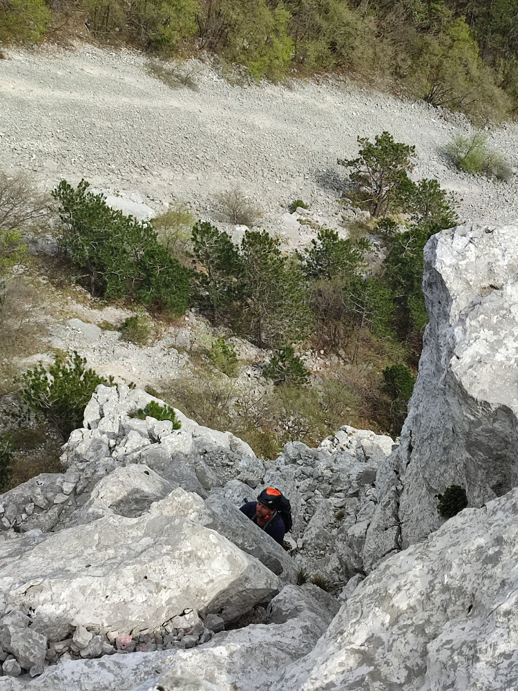 Po platki, ki jo smer deli s sosednjo Krvavo, gre tokrat hitreje, ker od spodaj dobivam usmeritve po lažjih prehodih. Predzadnji cug pa ponovno poteka po podrti grapi. Na srečo ga dobi soplezalec, ki med majavimi balvani najde nekaj dobrih mest za frende. Jaz zaključim s sprehodom po polički, ki se konča s kratko kompaktno zajedo. Tudi tu je problem samo zaupanje skali nad lusko.