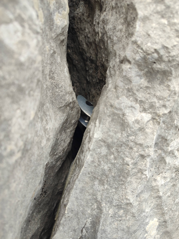 Pod steno Aleš hitro uvidi, da je logičen štart bolj po levi, kot kaže skica. Sprva po podrtem plezam previdno, a klin za polico mi da nekaj upanja. Na zadnjem od skokov malo psihiram, ker je kar športen, a me kot vedno reši trikam v kompaktni razpoki.